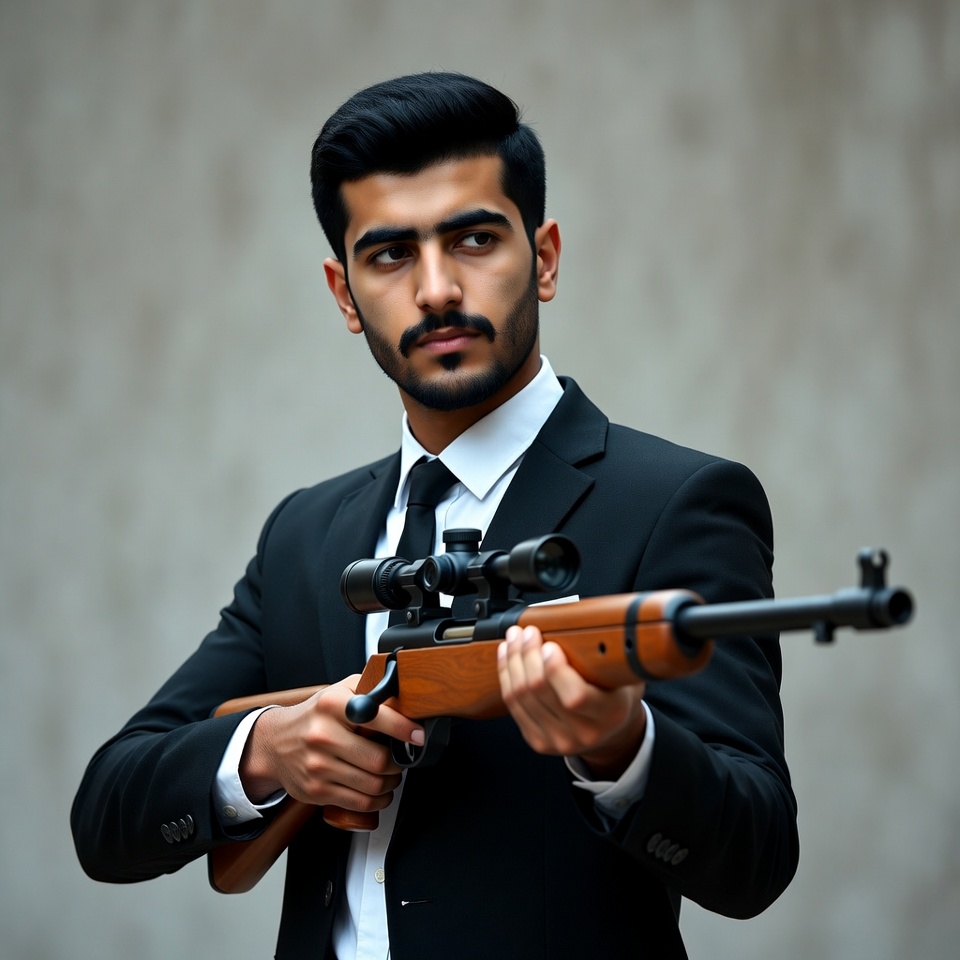 A young Middle Eastern man with black hair and a mustache stands confidently against a gray background. He wears a black suit, white shirt, and black tie while gripping a wooden air rifle with a scope. His pose is poised and direct-gazing.
