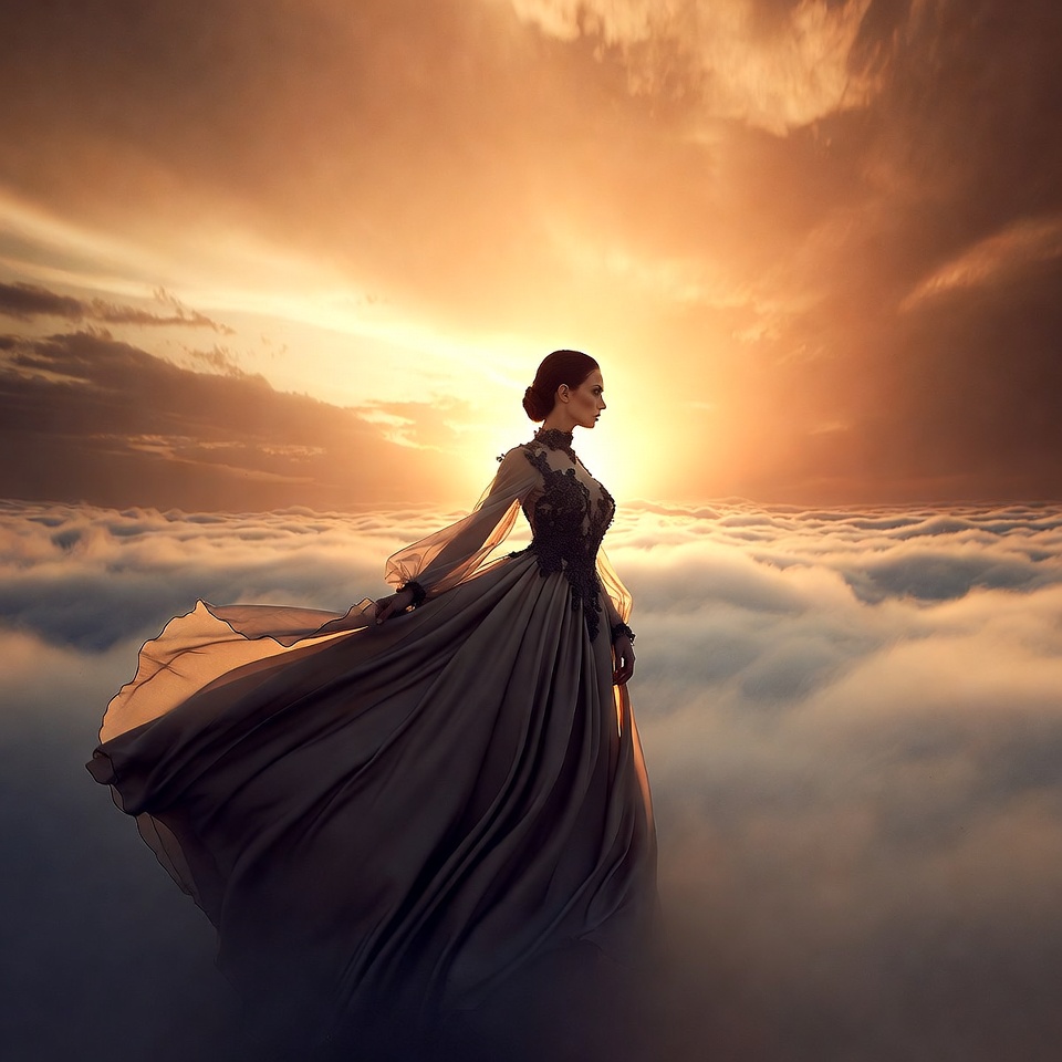 Woman in flowing gown on clouds