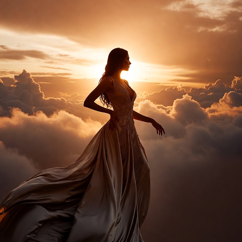 A woman's silhouette stands in profile wearing a flowing lace evening gown against a vibrant orange sunset sky filled with clouds. Her long wavy hair cascades down her back, and her gown billows dramatically in the wind. She poses gracefully with one hand on her hip amid the heavenly clouds.