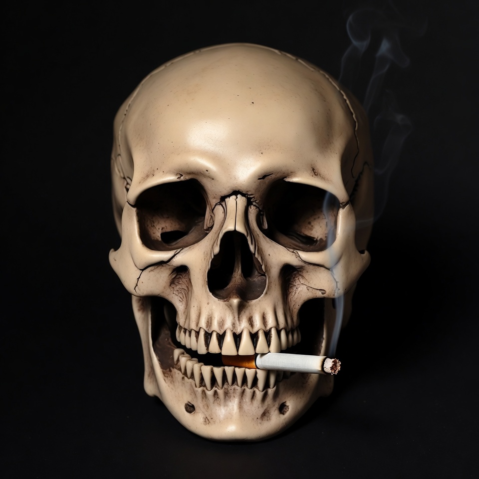 A realistic human skull with an unlit cigarette clenched between its teeth sits against a solid black background. Thin wisps of smoke rise from the cigarette tip. The skull features detailed bone structure, hollow eye sockets, and an open grin.