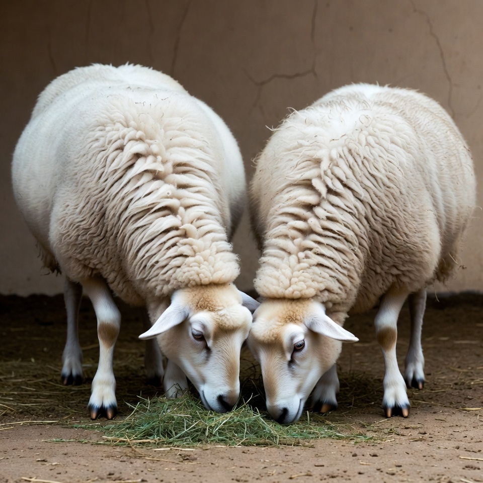 animal pair, barn, beige walls, curled horns, dirt floor, eating hay, farm animals, fluffy wool, grazing sheep, hay, livestock, sheep eating, two sheep, white sheep, sheep