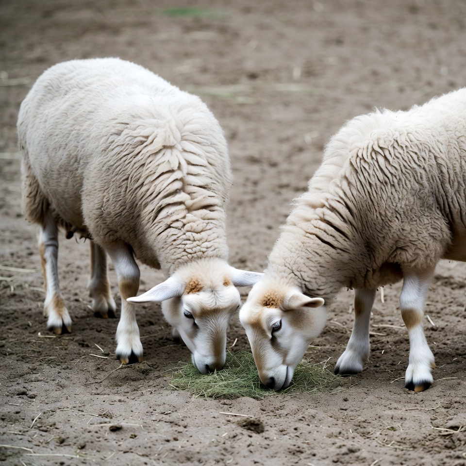 animal pair, barnyard, cute animals, dirt ground, eating grass, enclosure, farm animals, fluffy wool, grazing sheep, green grass, livestock, rural animals, sheep herd, two sheep, white sheep, woolly sheep, sheep