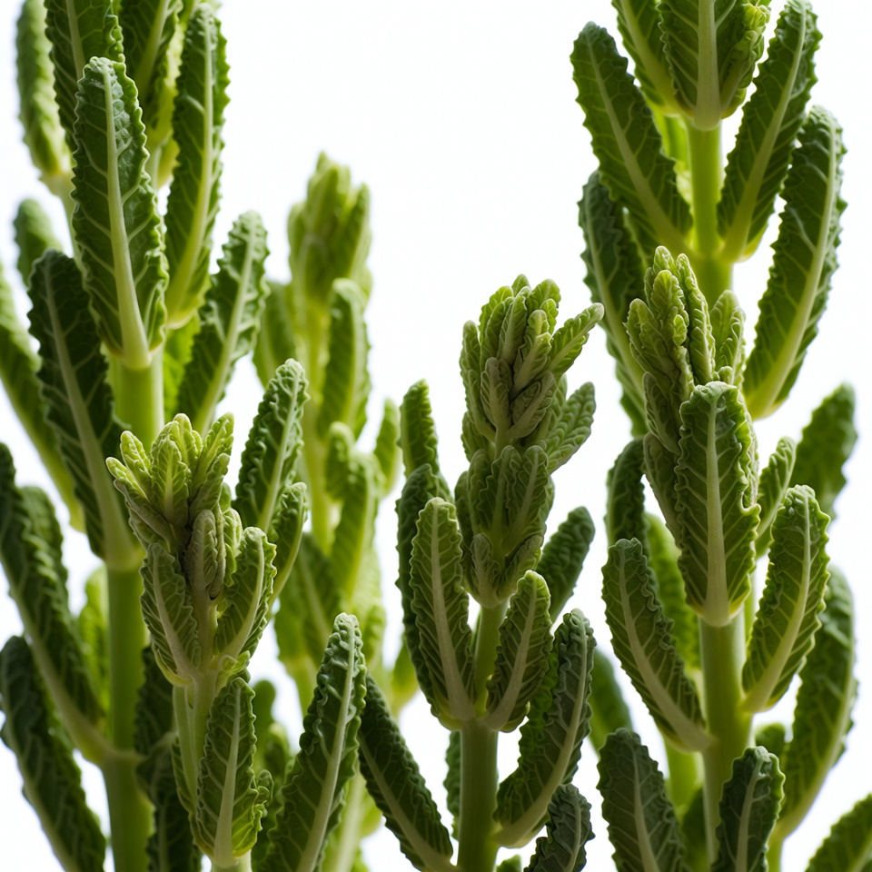 A cluster of vibrant green succulent plants with thick, fleshy leaves stands against a plain white background. The leaves feature serrated edges and upright stems, creating a symmetrical botanical arrangement. Fresh new growths emerge from the tips of several stems.