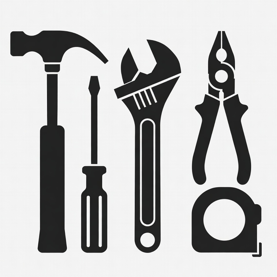 DIY tools, black icons, building tools, clipart, construction tools, hand tools, hardware tools, illustration, isolated background, pliers, repair tools, screwdriver, silhouettes, tape measure, toolbox, tools, wrench, hammer