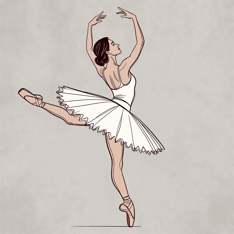 An illustration of a ballerina performing a graceful dance pose from a side view. She wears a white tutu, leotard, and pointe shoes, with her arms extended elegantly and one leg lifted high. The image features a simple gray background.
