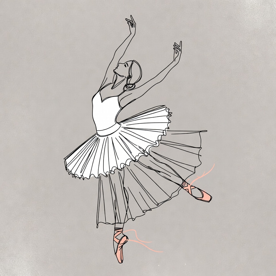 Line drawing illustration of a ballerina in mid-dance pose on a gray background. She wears a white tutu, leotard, and pink pointe shoes with ribbons. Her arms are gracefully extended and one leg lifted high.