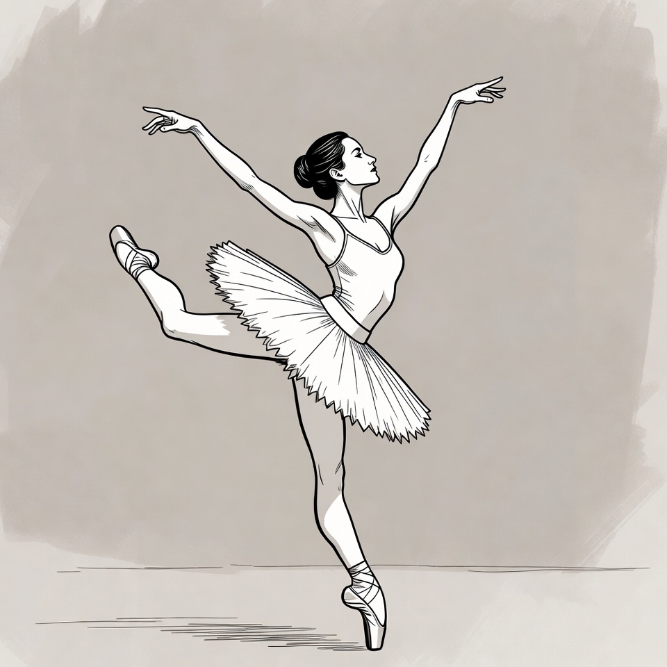 A black and white ink illustration depicts a ballerina performing an arabesque pose. She wears a white tutu, leotard, and pointe shoes, with her arms extended gracefully and one leg lifted high behind her. Her dark hair is in a bun, and she stands on a plain beige background.