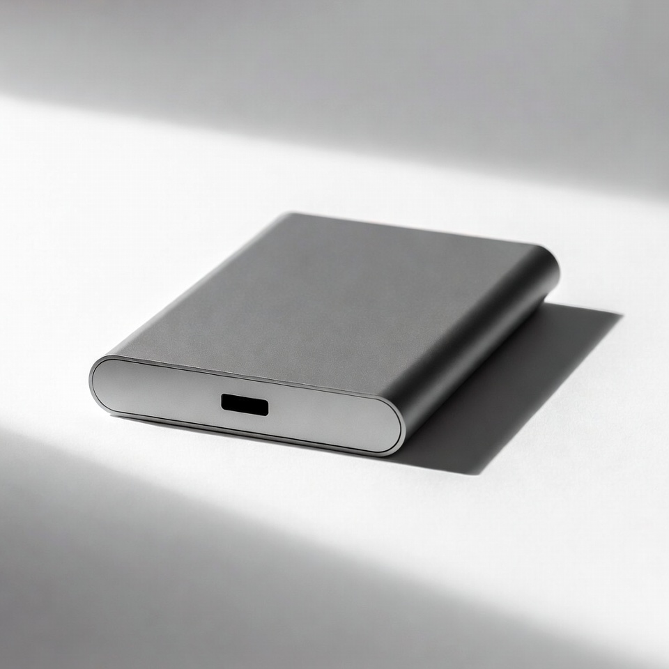 USB-C, battery, charger, electronics, gadget, isolated background, metal, mobile battery, portable charger, product photo, rectangular, silver, tech accessory, white background, power bank