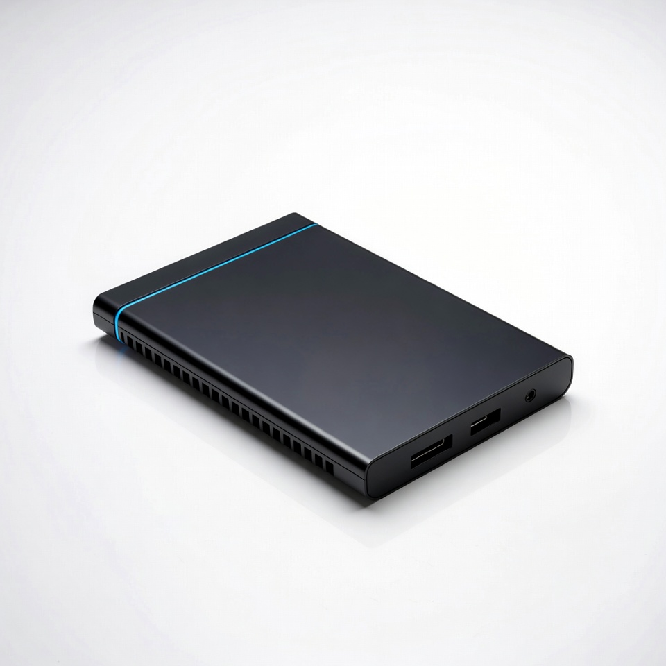 USB ports, black SSD, blue trim, computer hardware, data storage, external drive, isolated background, portable SSD, product photo, rectangular drive, solid state drive, storage device, tech gadget, vented design, SSD