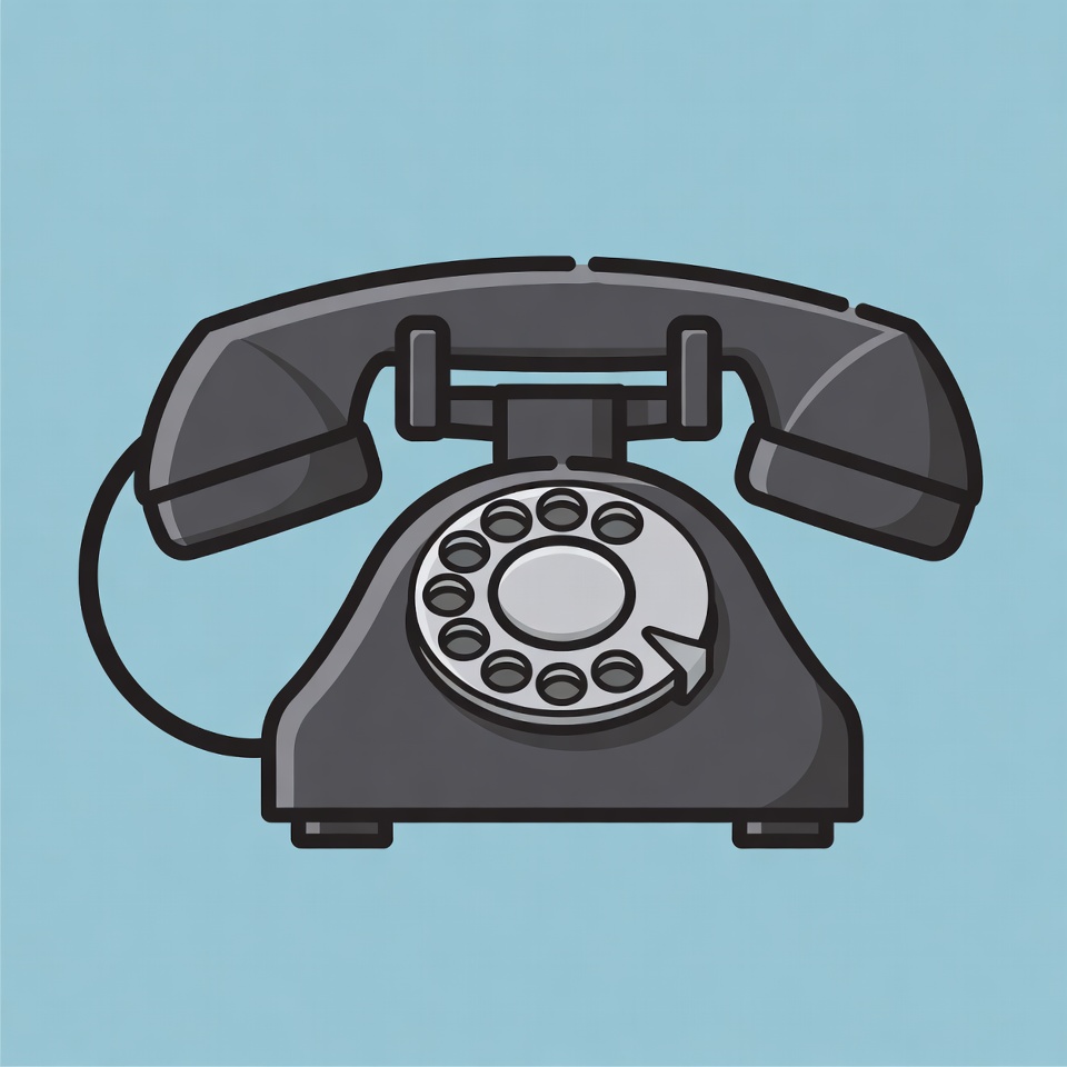 A black vintage rotary dial telephone is illustrated with a simple line art style on a light blue background. The phone features a curved handset, coiled cord, and a white dial with finger holes and a metal stopper. It stands upright in an isolated view.