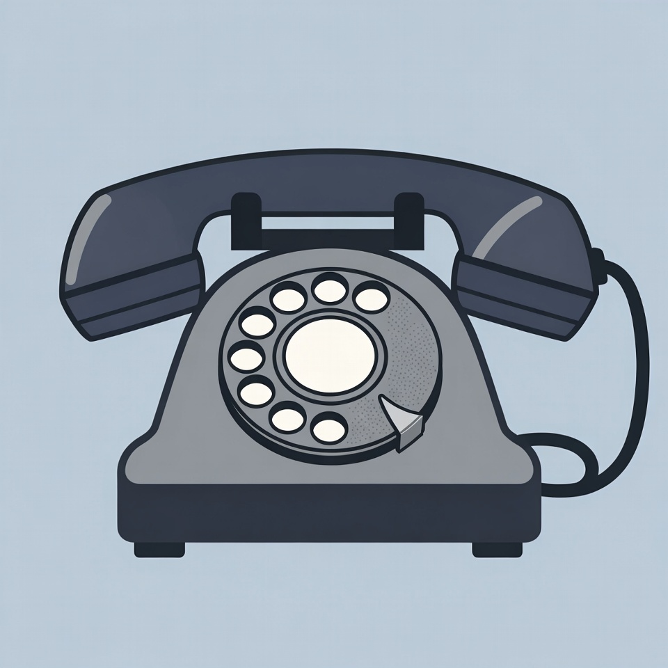 A black vintage rotary dial telephone is illustrated on a light blue background. The phone features a curved handset, a prominent white dial with black numbers, and a coiled cord. It is depicted in a simple flat design style.