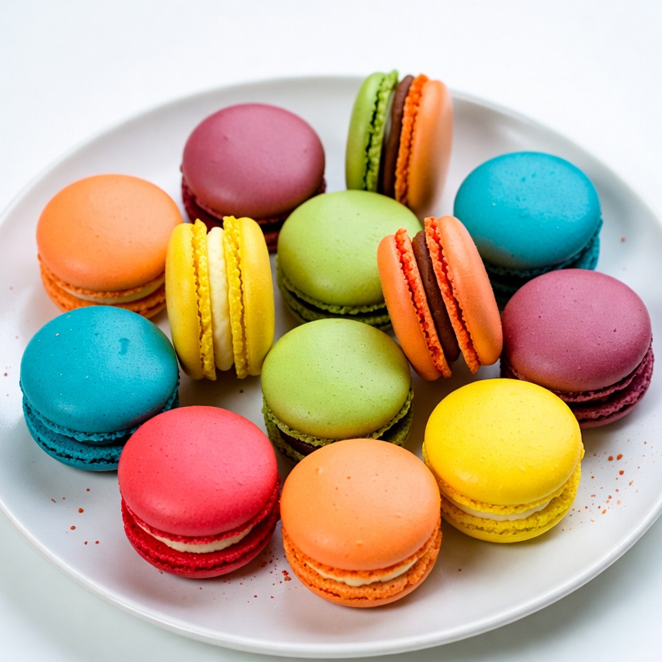French macarons, baked goods, colorful macarons, confectionery, desserts, food photography, gourmet treats, green macarons, isolated background, orange macarons, pastries, pink macarons, purple macarons, red macarons, sweets, teal macarons, white plate, yellow macarons, macarons