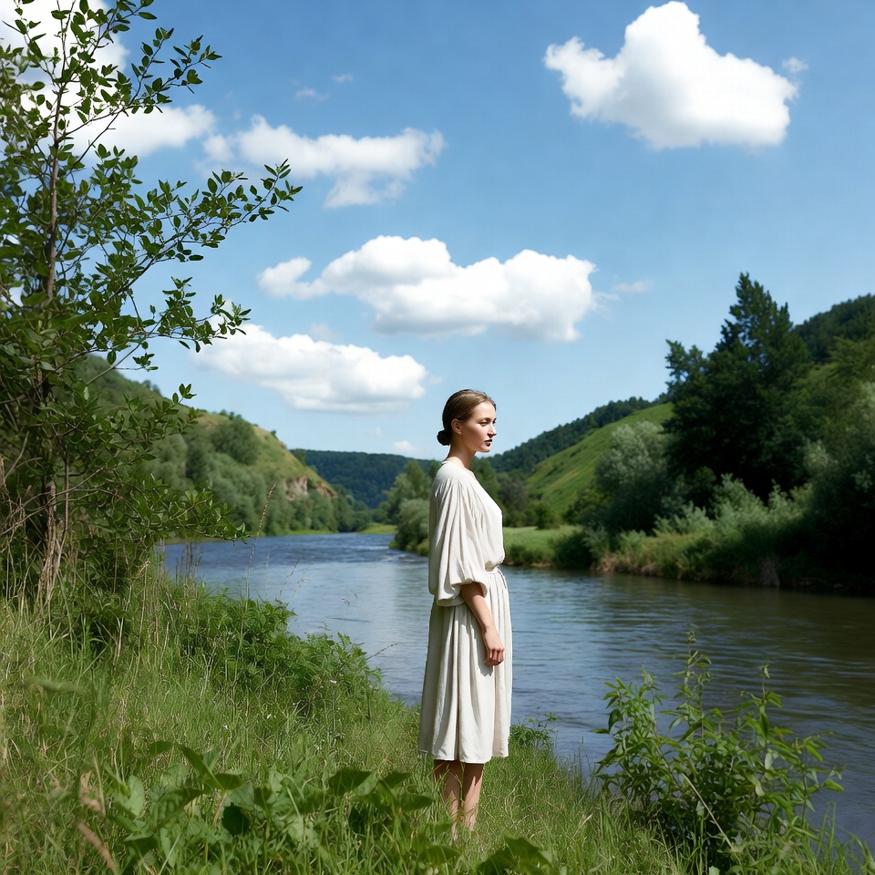 A woman with blonde hair in a bun stands barefoot on grassy riverbank wearing a flowing white dress with sleeves. She faces away toward a serene river winding through green hills and trees under a bright blue sky with white clouds. Lush green foliage and distant cliffs frame the landscape.