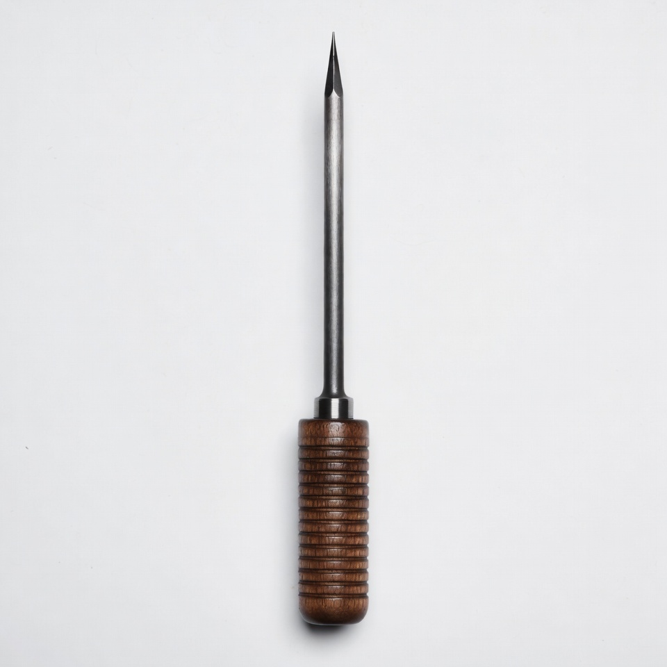 brown handle, closeup, crafting tool, handmade tool, isolated background, leather awl, metal tip, pointed tool, ridged grip, sewing awl, sharp point, tool, vertical orientation, white background, wooden handle, awl