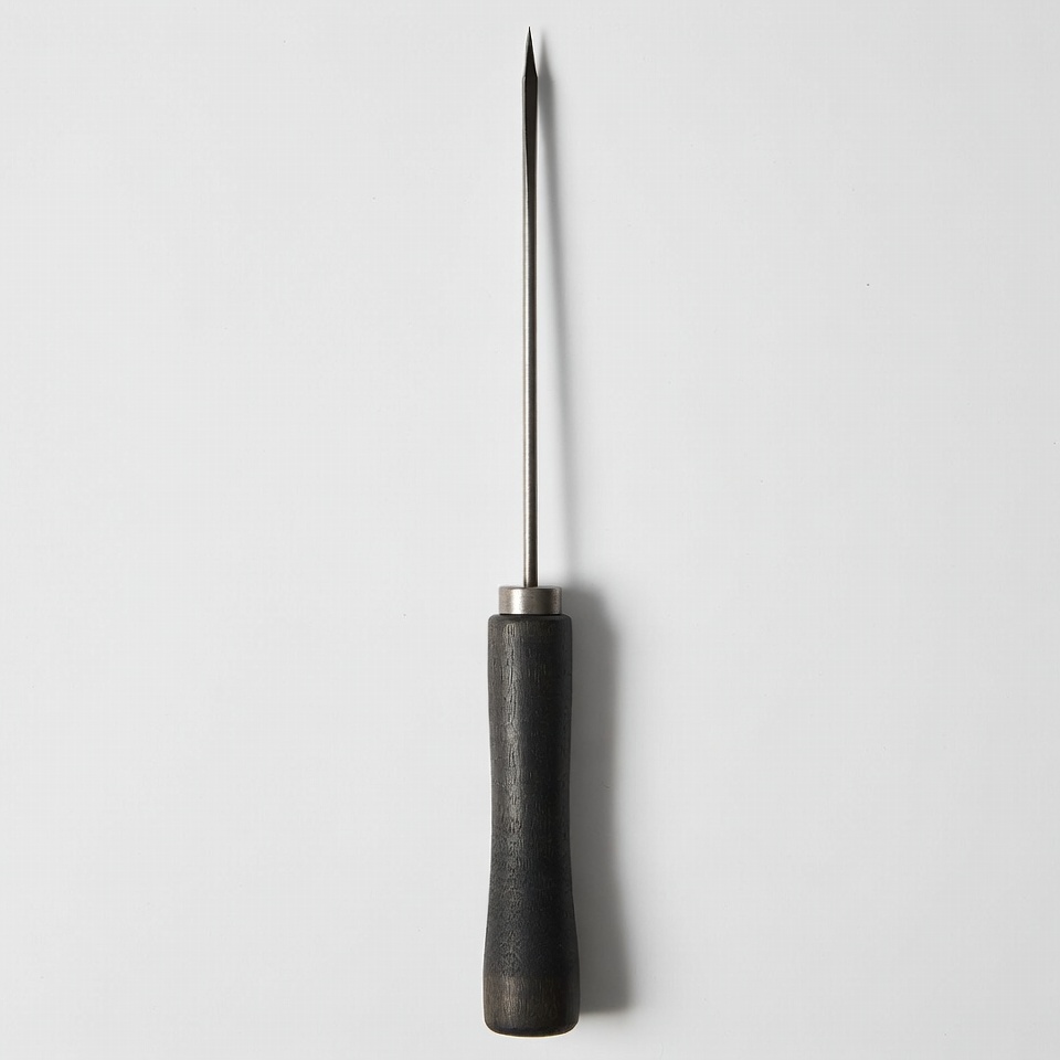A sharp metal awl with a pointed tip and wooden handle stands vertically on a white background. The handle is dark and cylindrical, securely attached to the tapered steel shaft. It is isolated against the plain white surface.
