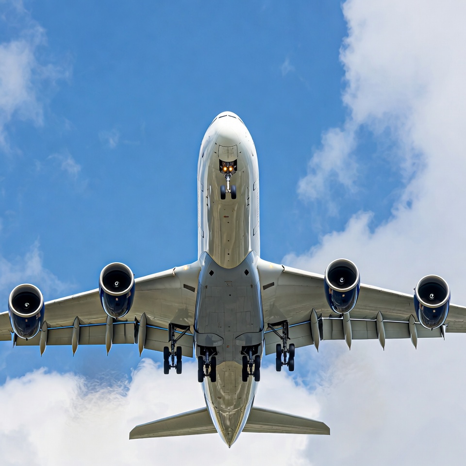 aircraft, airliner, airplane, aviation, blue sky, cloudy sky, commercial plane, flying, four engines, fuselage, jet engines, jetliner, landing gear, overhead view, passenger jet, rear view, tail fin, transportation, travel, white airplane, white clouds, Airbus A380