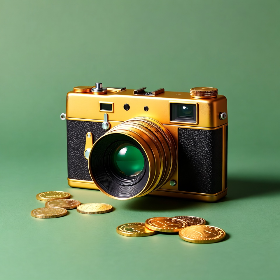 A gold vintage camera with a large lens sits on a green background surrounded by scattered gold coins. The camera features black leather accents and shiny metallic details. The coins are piled and spread out around the base of the camera.