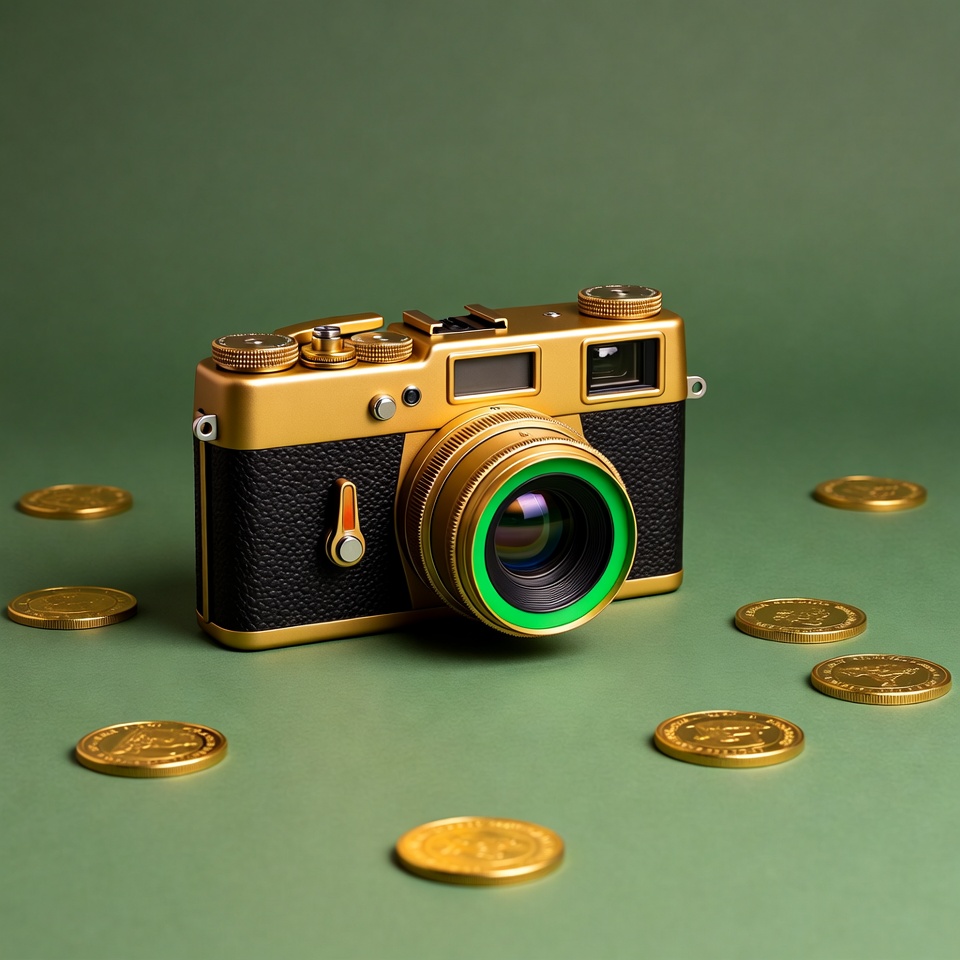 Gold Camera with Coins on Green Background