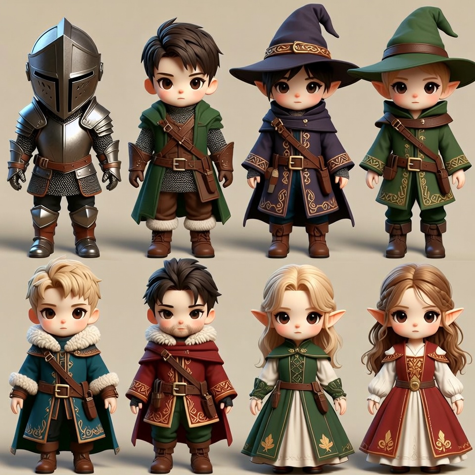 3D render, White, belts, boots, boys, cute fantasy, elf dress, elves, fantasy knights, girls, green cloak, group pose, illustration, isolated background, knight armor, long hair, medieval clothing, wizard hat, young boys, young girls, chibi characters
