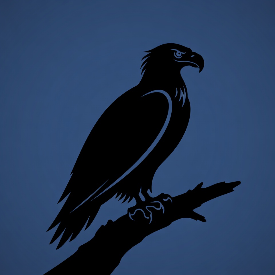 A black silhouette of a majestic eagle stands perched on a tree branch against a dark blue background. The eagle features detailed feathers, sharp beak, and intense eyes in profile view. The isolated illustration emphasizes the bird's powerful stance.
