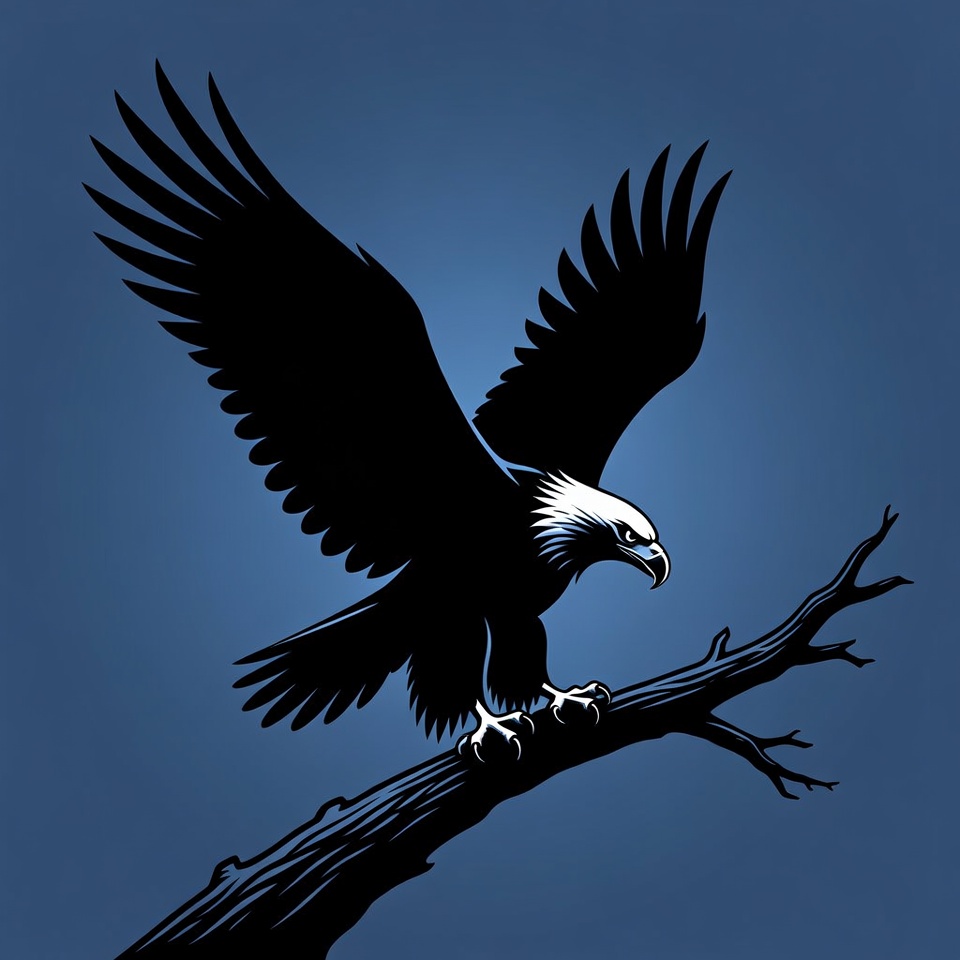 A black silhouette illustration of a bald eagle with white head detail perches on a tree branch. Its wings are partially spread, and talons grip the rough branch firmly. The image features a dark blue background with an isolated design.