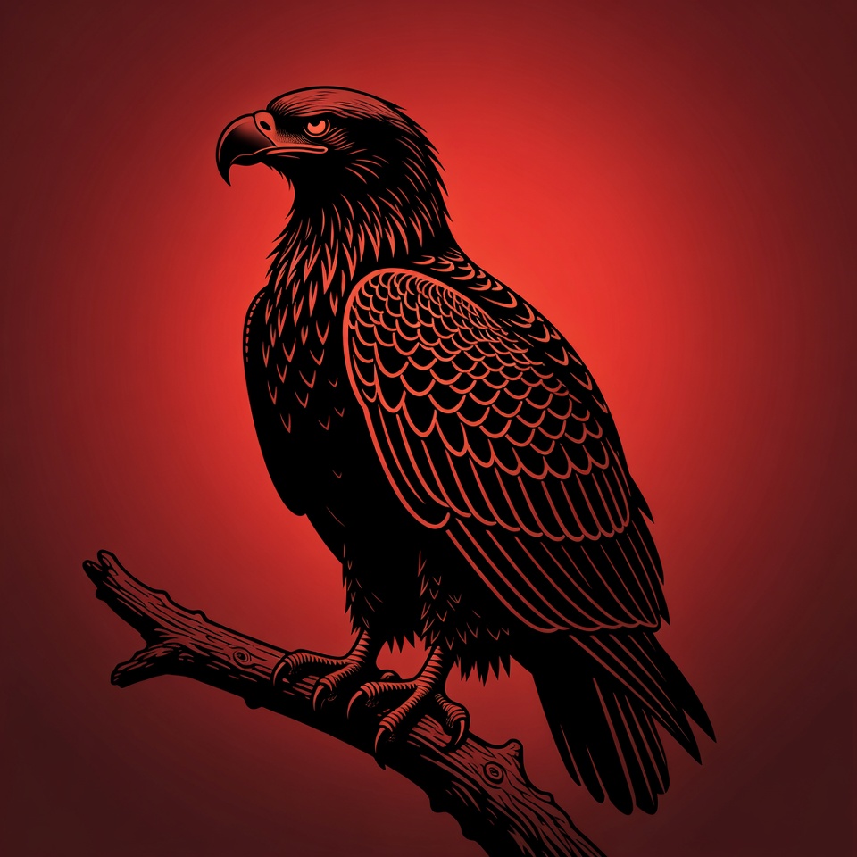 A detailed black silhouette illustration of a bald eagle perched on a wooden branch. The eagle features intricate feather patterns, sharp beak, and intense eyes. It stands against a vibrant red gradient background.