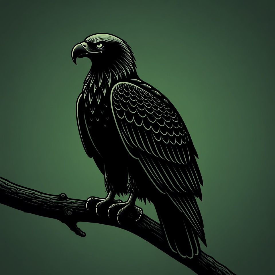bird, bird of prey, black eagle, branch, clipart, detailed feathers, eagle, eyes, feathers, green background, illustration, isolated background, perched, raptor, silhouette, talons, vector art, wildlife, bald eagle