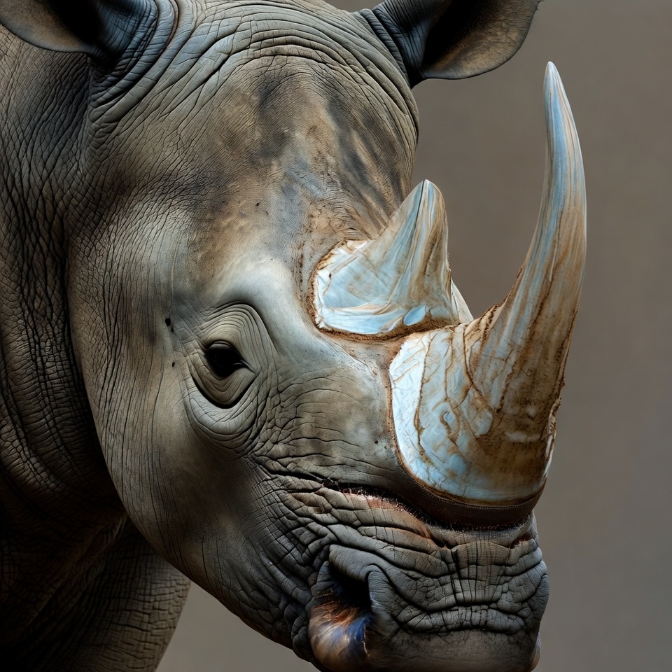 A white rhinoceros faces the camera with a prominent horn curving upward. Its thick gray skin shows natural folds and texture around the eyes and mouth. The animal's expression is calm against a neutral background.
