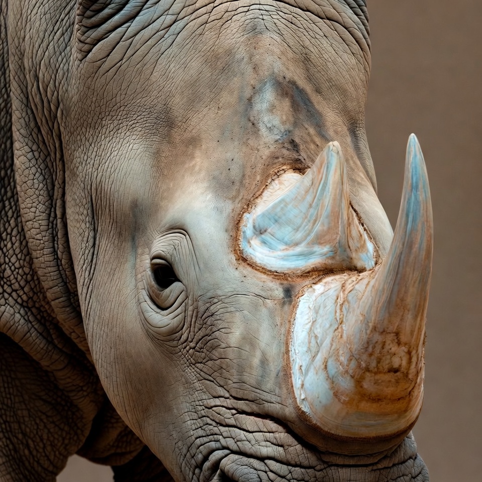 A white rhinoceros faces forward with a prominent horn curving upward. Its thick, wrinkled gray skin covers the face and neck. The eye gazes directly ahead against a neutral background.