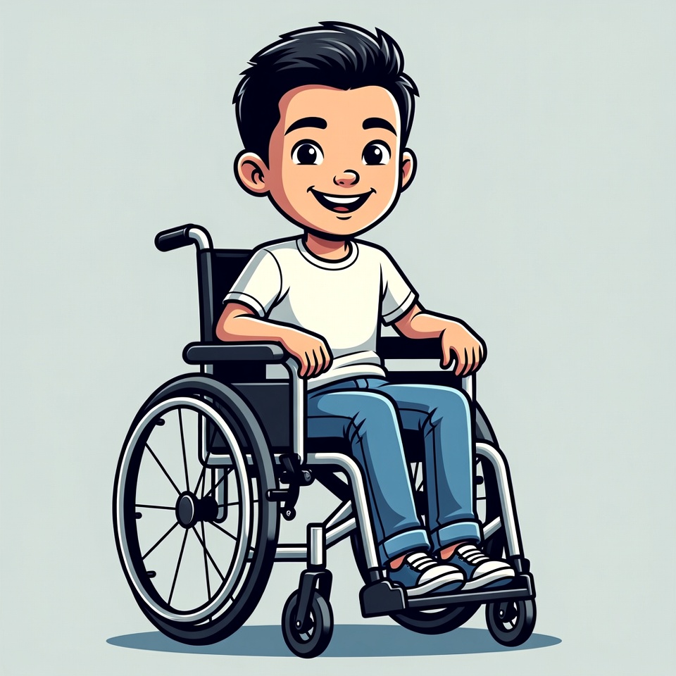 A cartoon Asian boy with short black hair smiles happily while sitting in a black wheelchair. He wears a white t-shirt, blue jeans, and white sneakers. The illustration features a simple gray background.
