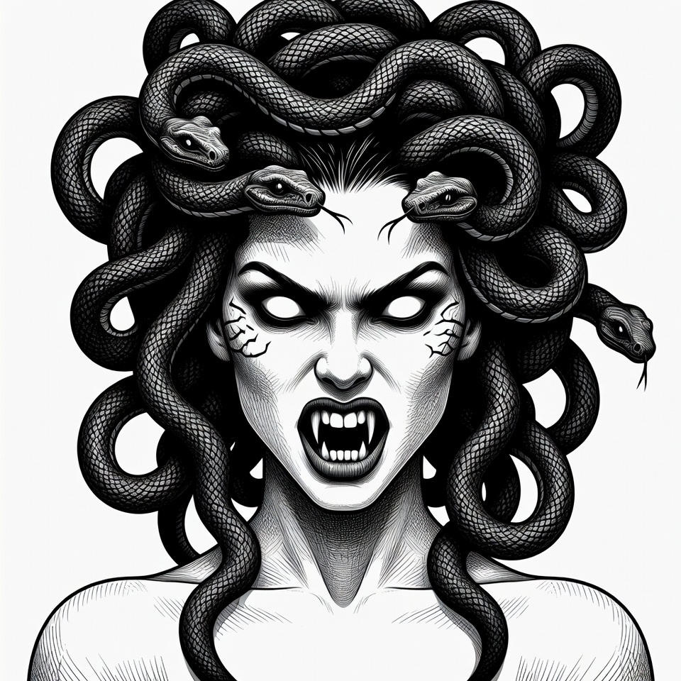 A fierce Medusa illustration features a woman's face with wild black snakes writhing as her hair. She has glowing red eyes, sharp fangs bared in a snarl, and intricate line art details on her pale skin. The black and white drawing is isolated on a white background.