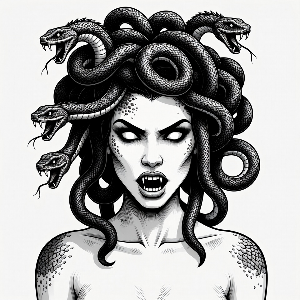 A fierce female Medusa illustration features her face with glowing eyes and fangs bared. Multiple live snakes coil and hiss as her hair atop her head. Her skin shows scale patterns on shoulders against an isolated black background.