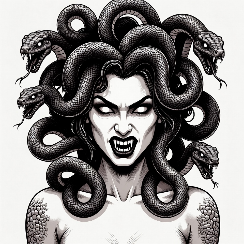 A fierce Medusa illustration features a woman with pale skin and intense red eyes snarling with fangs bared. Her hair is replaced by numerous twisting black snakes with detailed scales and glaring eyes. She has intricate tattoos on her shoulders and is depicted against a white background.