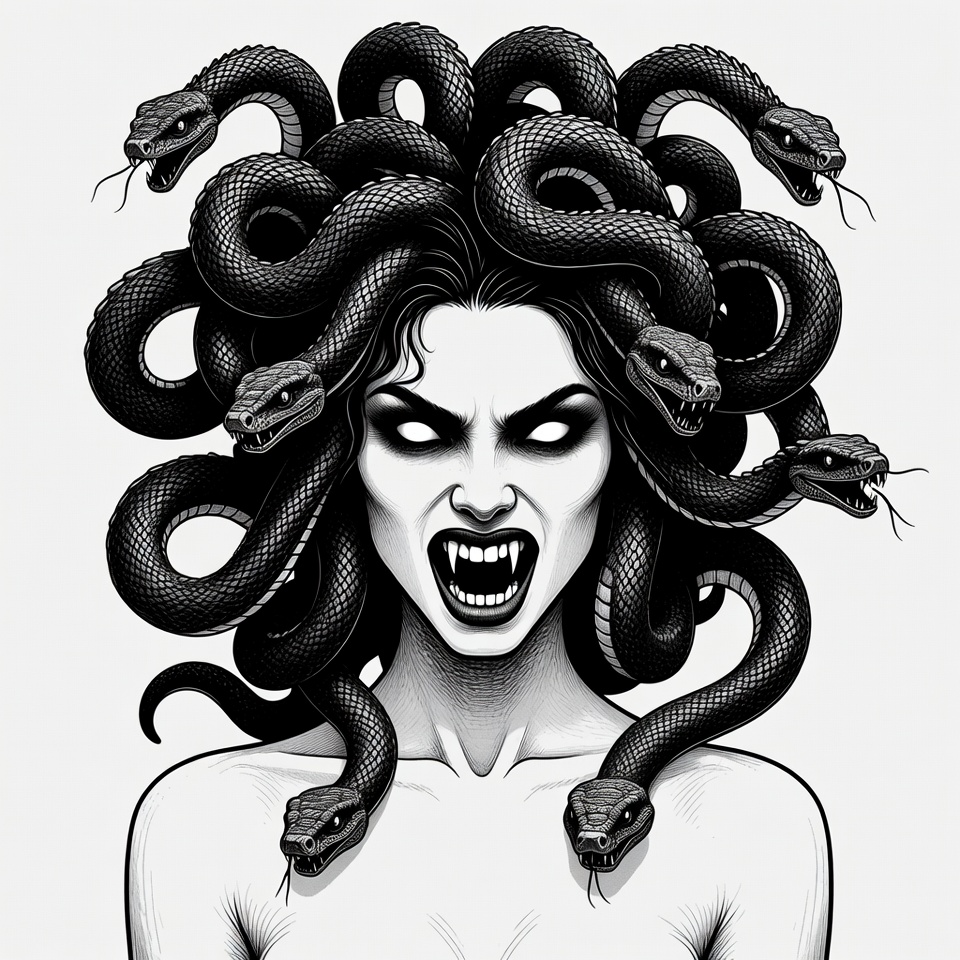 Greek myth, White, black snakes, fangs, fantasy, female, fierce expression, hair, head, horror art, illustration, line art, monster, mythical creature, mythology, pale skin, portrait, serpents, snakes, snarling face, tattoo design, white eyes, woman, Medusa