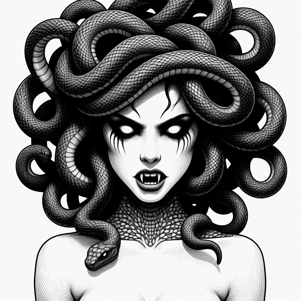Greek, black white, coils, dark makeup, detailed, eyes, face, fangs, fierce, gothic, hair, illustration, isolated background, line art, monster, mythology, neck, pale skin, portrait, serpents, snakes, vampire, woman, Medusa