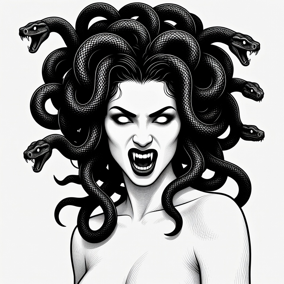 A fierce Medusa illustration features a woman's face with wild black snakes writhing as her hair. She bares her sharp teeth in a menacing snarl with glowing eyes. The black and white line art shows her topless on an isolated background.