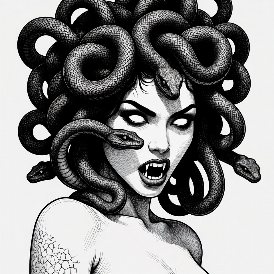 Greek mythology, White, black and white, coiled snakes, detailed drawing, fangs, fantasy, female, fierce, glowing eyes, gothic, hair, horror art, illustration, mythical creature, open mouths, portrait, scales, serpents, snakes, vampire teeth, woman, Medusa