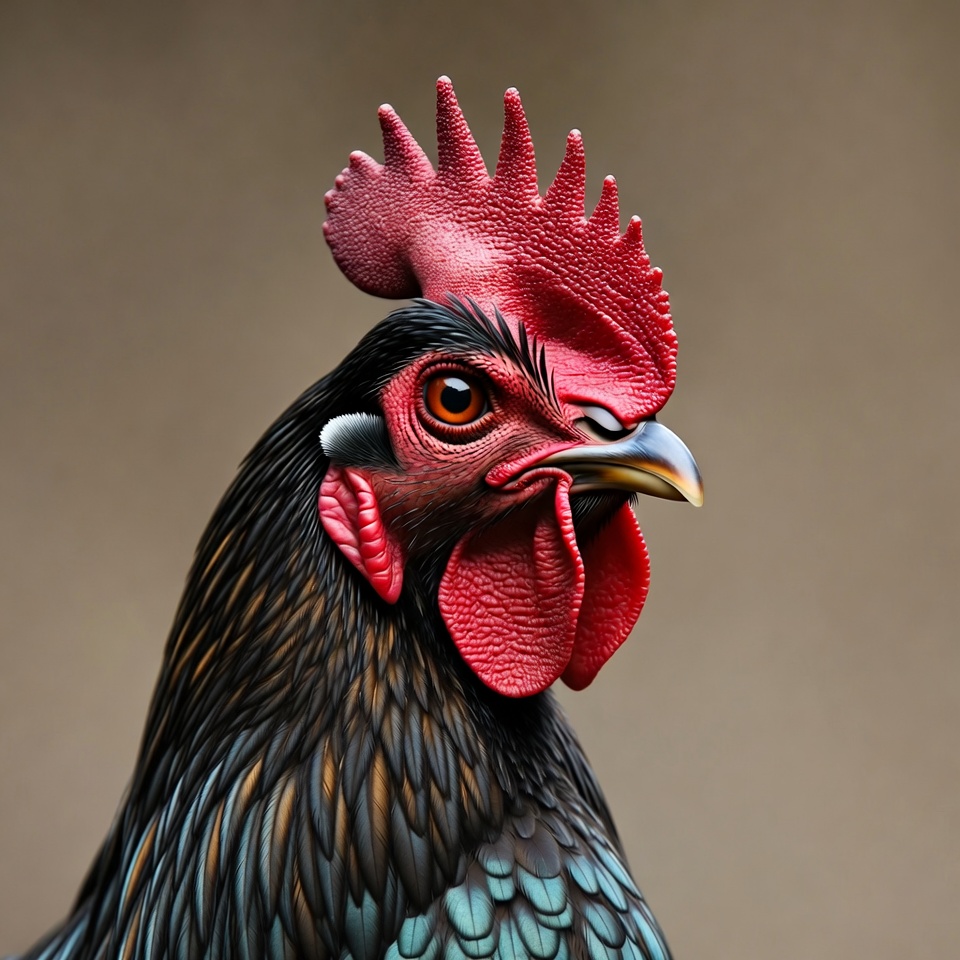 A majestic black rooster stands with a vibrant red comb and wattle. Its glossy feathers shimmer with iridescent green hues, and it features a sharp yellow beak and intense orange eye. The bird is positioned against a neutral beige background.