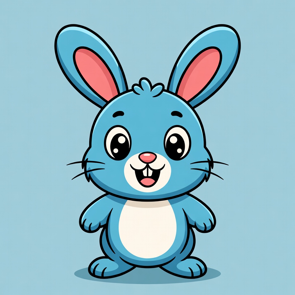 adorable rabbit, animal illustration, big eyes, bunny illustration, cartoon bunny, clipart bunny, cute bunny, fluffy bunny, fun character, happy bunny, isolated background, kawaii bunny, pink ears, smiling bunny, standing bunny, vector bunny, white belly, blue bunny