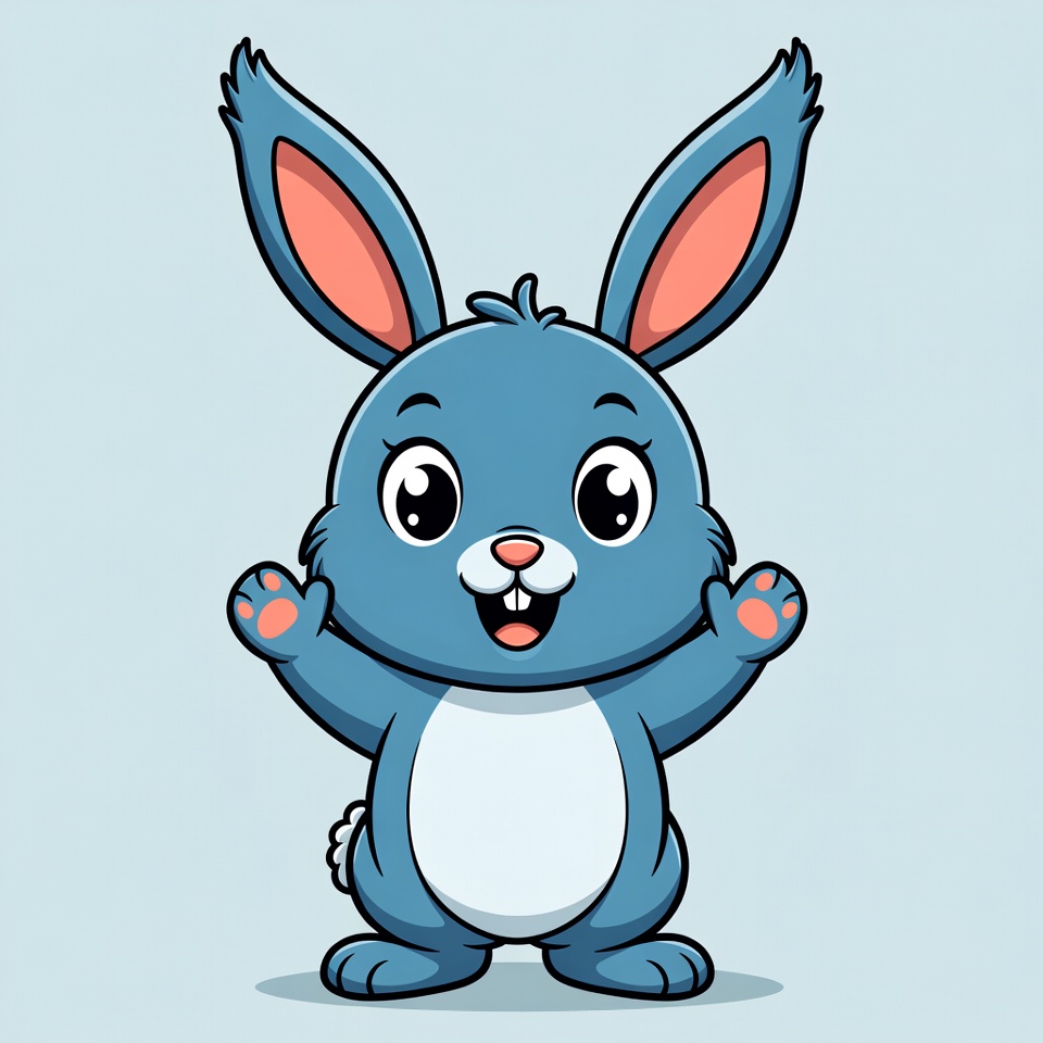 A cartoon blue bunny with large pink ears stands on a light blue background. It has big expressive eyes, a smiling mouth, and white belly fur. The bunny raises both paws in a cheerful waving gesture.