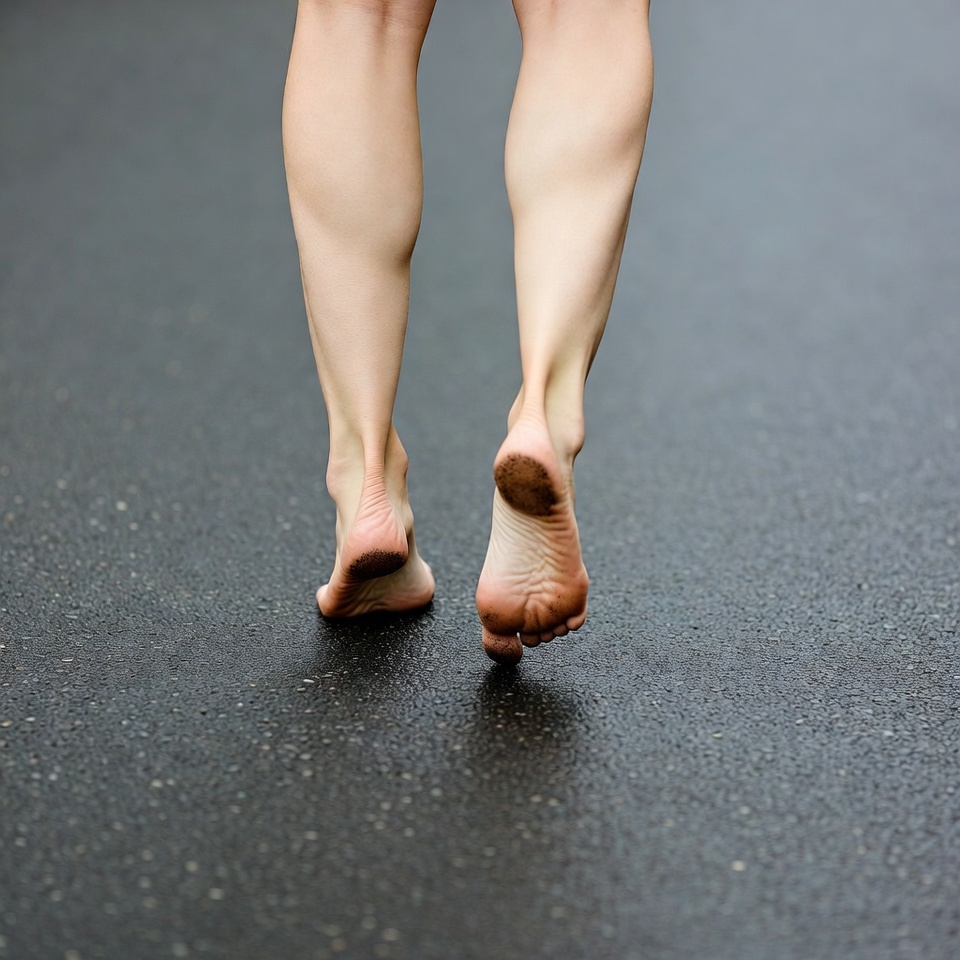 A woman's bare feet and toned legs are shown from behind as she walks on a wet, dark road. Her soles are slightly dirty, and the pavement glistens with moisture. The focus is on the feet and lower legs against the reflective surface.