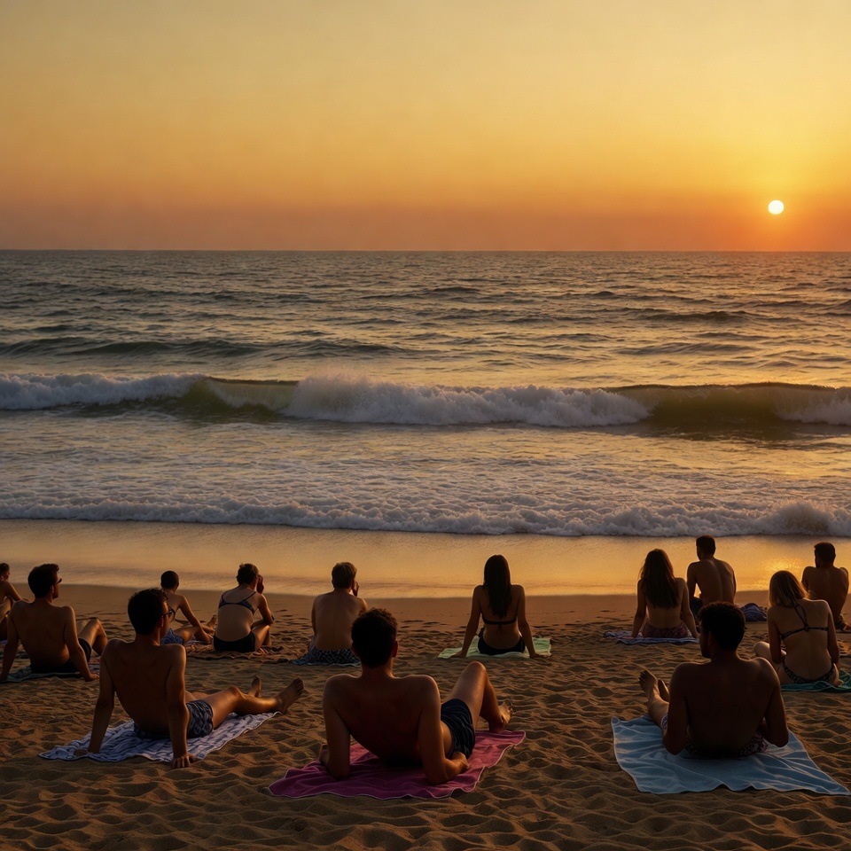 A diverse group of men and women sit on colorful towels on the sandy beach, facing the ocean in yoga poses. Gentle waves crash nearby under a vibrant orange sunset sky with the sun low on the horizon. They wear swimsuits and appear relaxed during the evening session.