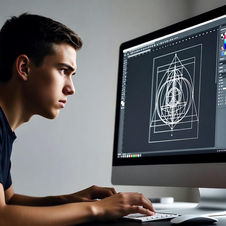 A young man with short dark hair sits at a desk, intently working on a large iMac computer screen displaying geometric design software. He wears a dark t-shirt and types on the keyboard with focused concentration. The setup is on a clean desk with a mouse and keyboard in a modern workspace.
