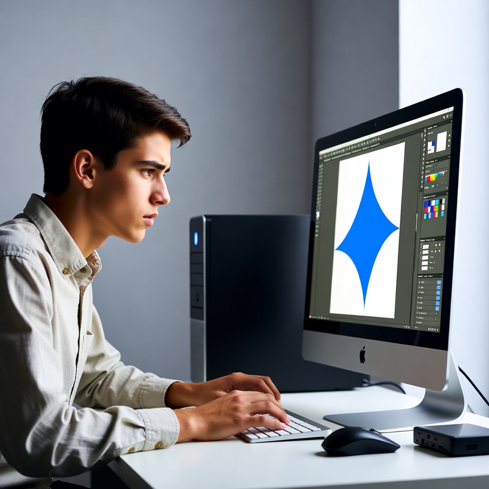 A young man with short dark hair sits at a desk, focused on a large iMac screen displaying Adobe Illustrator software with a blue diamond shape and color panels. He wears a light blue button-up shirt and types on a keyboard next to a black mouse. The setup is on a white desk in a dimly lit room with a computer tower nearby.