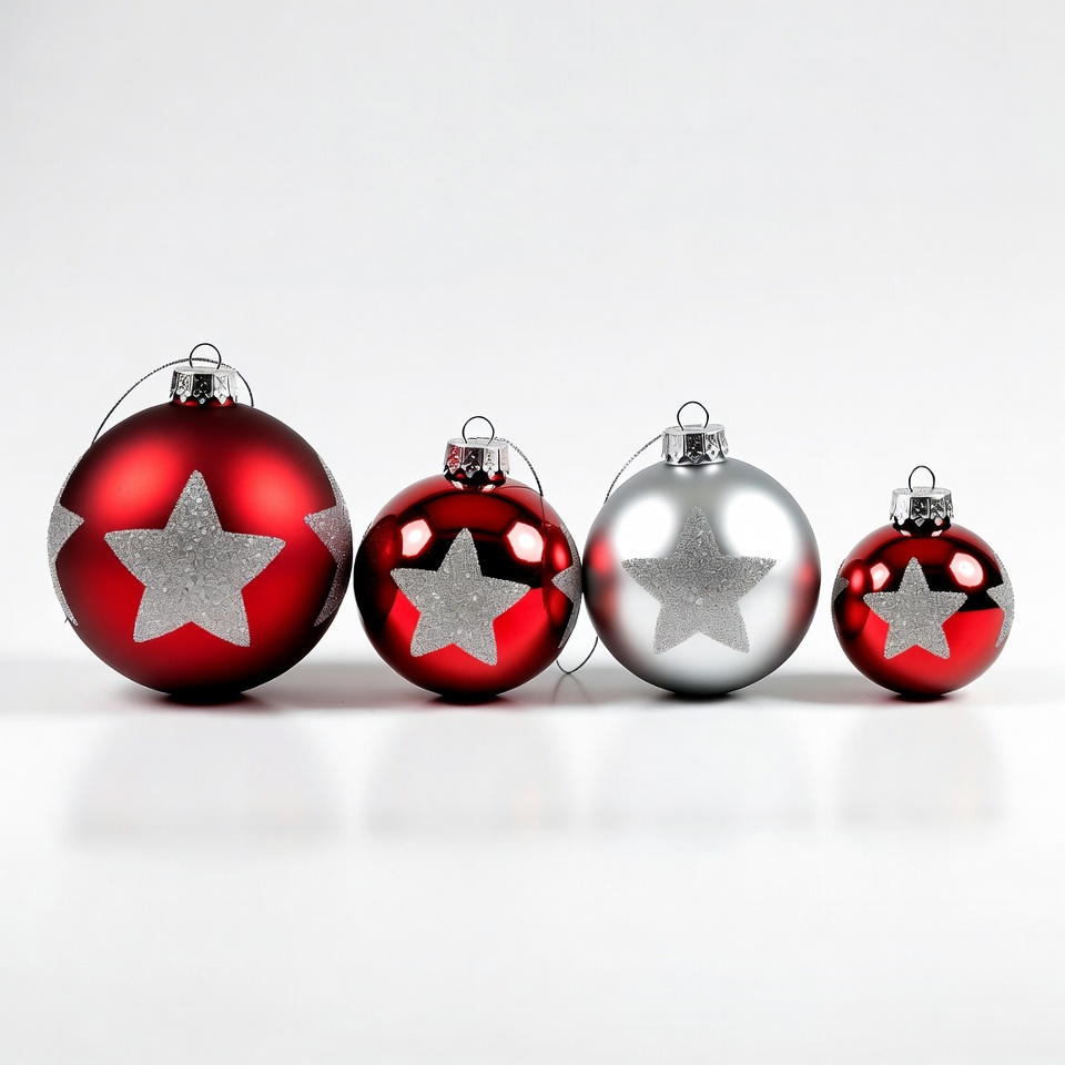 Four shiny Christmas baubles with star designs hang from strings against a white background. Three are red with silver stars, and one is silver with a subtle star pattern. They vary slightly in size, arranged in a row.