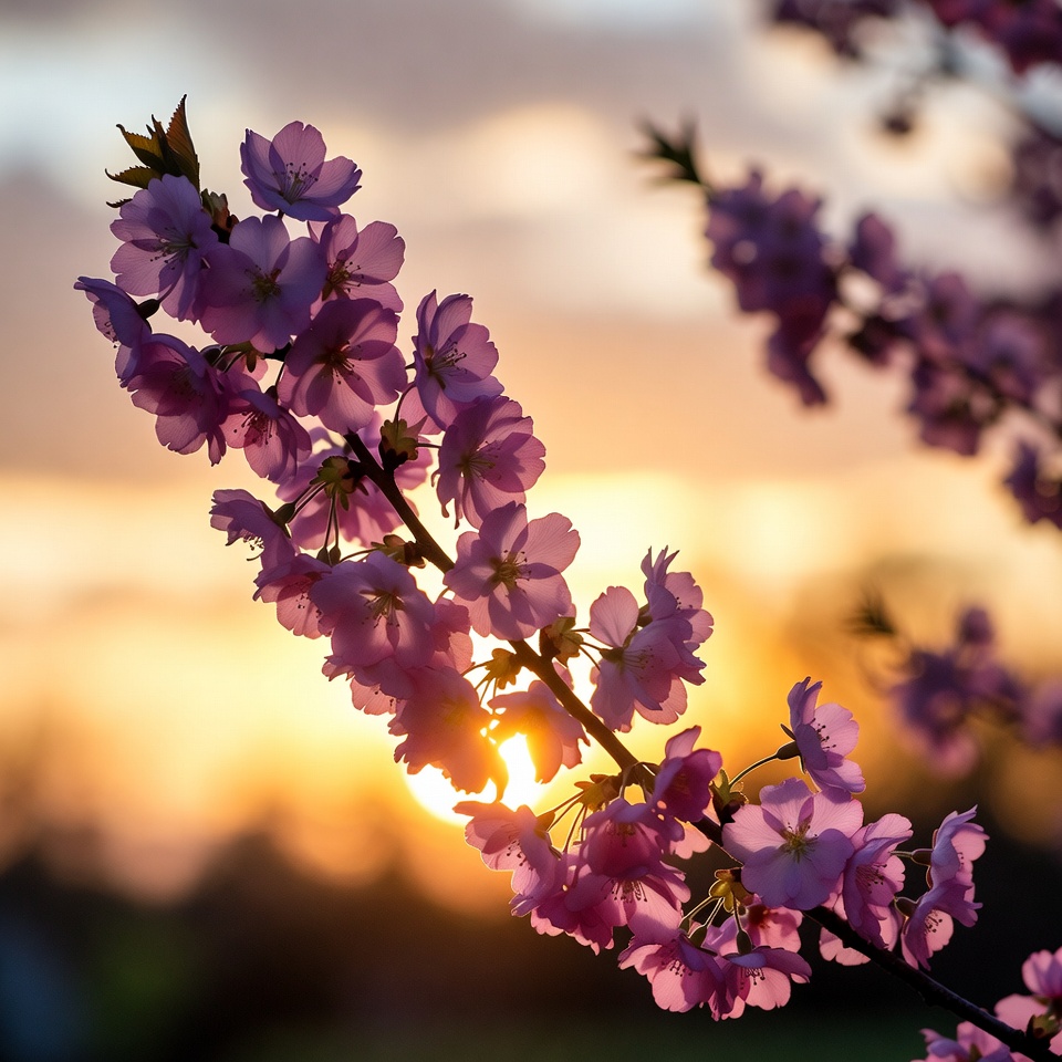backlit flowers, bloom, blossoms, bokeh, branches, cherry tree, clouds, dusk, floral, flower cluster, garden, golden hour, nature, outdoor, petals, pink flowers, pink petals, sakura, silhouette, sky, soft focus, spring flowers, sunset, tree branch, warm light, cherry blossoms