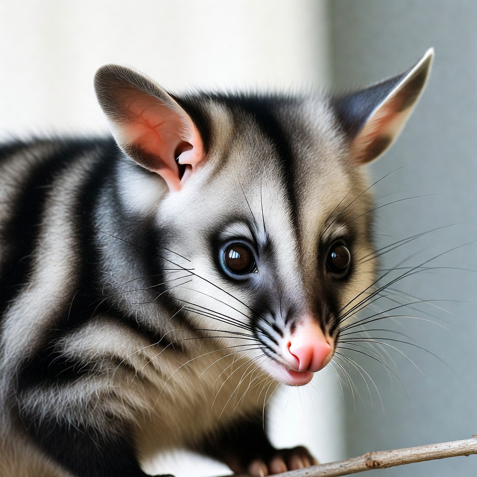 A cute sugar glider with grey and black striped fur sits on a thin branch. It has large round eyes, pink nose, and prominent ears. The animal faces forward against a plain light background.