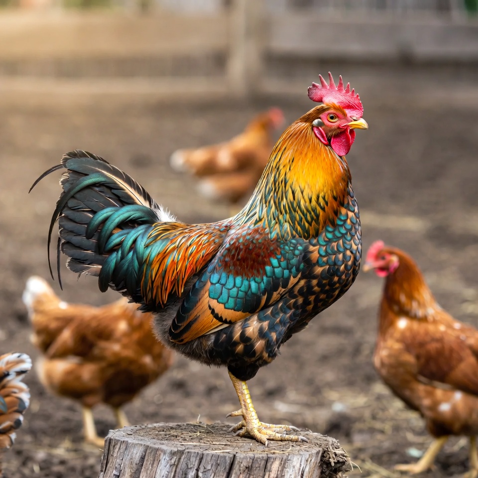 A vibrant multicolored rooster with red comb, golden feathers, green and black plumage stands proudly on a wooden stump in a farmyard. Several brown hens are scattered in the background near a fence under sunny skies. The rooster's tail feathers fan out impressively.