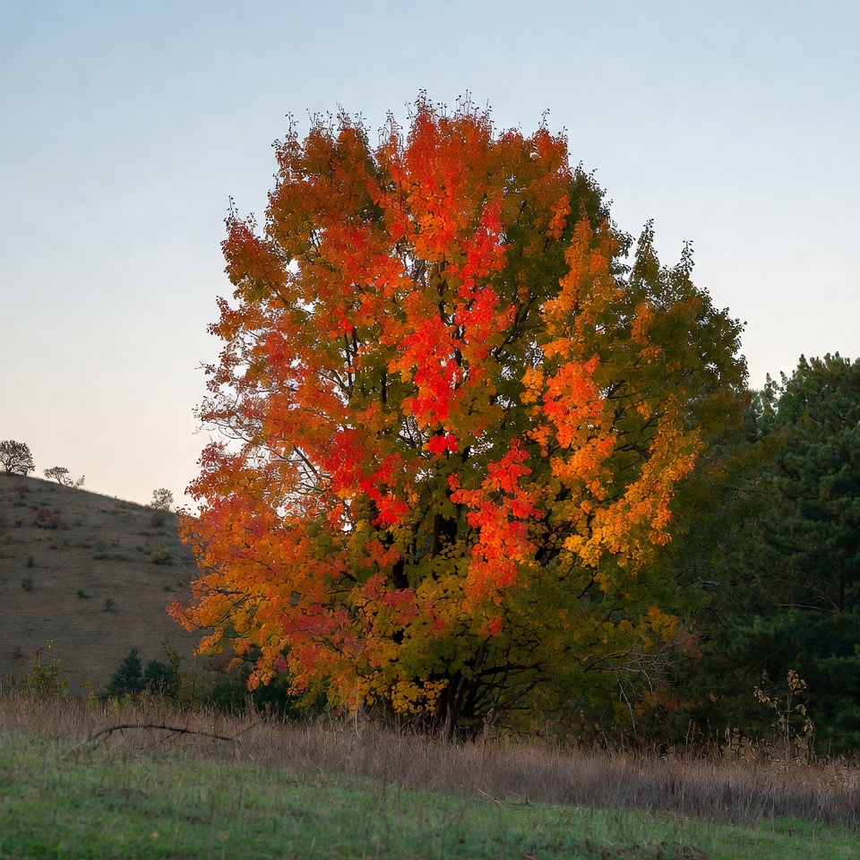 A tall maple tree with brilliant red and orange autumn leaves stands prominently against a clear blue sky. It is situated on a grassy hill with scattered green pine trees in the background and dry grass at its base. The foliage displays a mix of fiery red, yellow, and green hues typical of fall coloration.