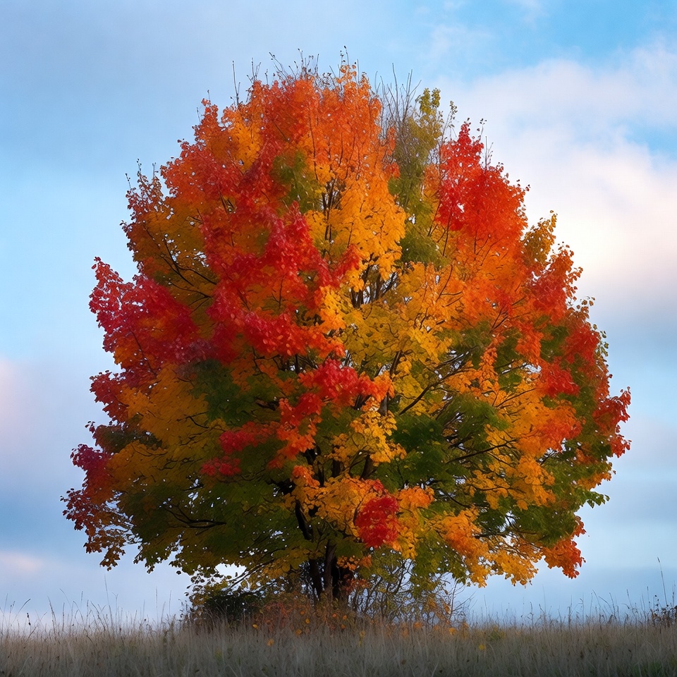 autumn colors, blue sky, branches, clouds, colorful tree, fall foliage, foliage, grass field, landscape, maple tree, nature, orange leaves, red leaves, tree trunk, vibrant colors, yellow leaves, autumn tree